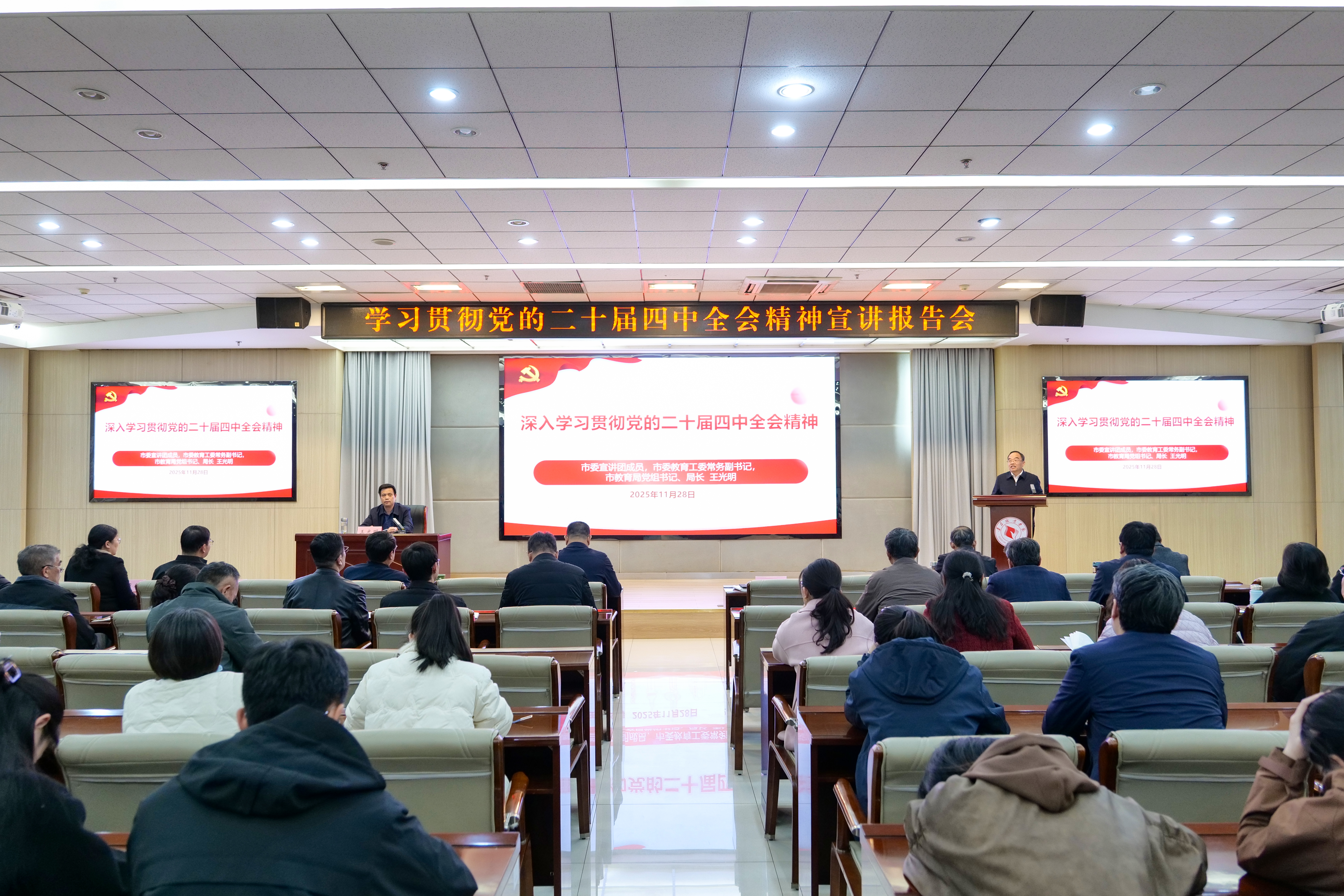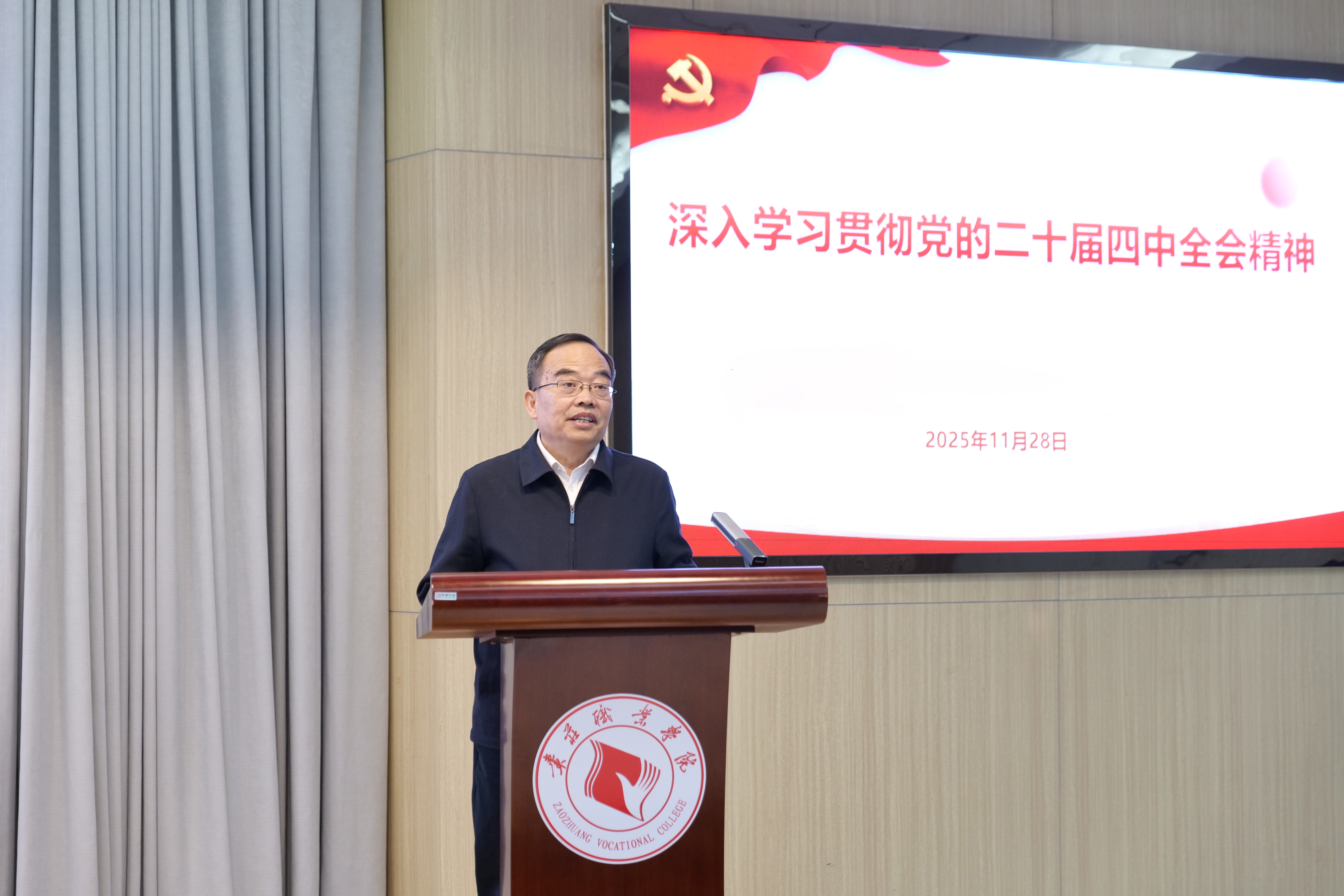 根据市委统一部署,11月28日,学习贯彻党的二十届四中全会精神市委宣讲团报告会在枣庄职业学院举行。市委宣讲团成员、市委教育工委常务副书记、市教育局党组书记、局长王光明作宣讲报告。枣庄职业学院党委书记郝荣平主持报告会,学院领导张华伟、刘希震、闫博、郝艺、曹先贺,各系(院)、部门党政负责人,副科级以上干部,以及马克思主义学院专职思政课教师、学院宣讲团成员、辅导员班主任、学生代表150余人参加报告会。