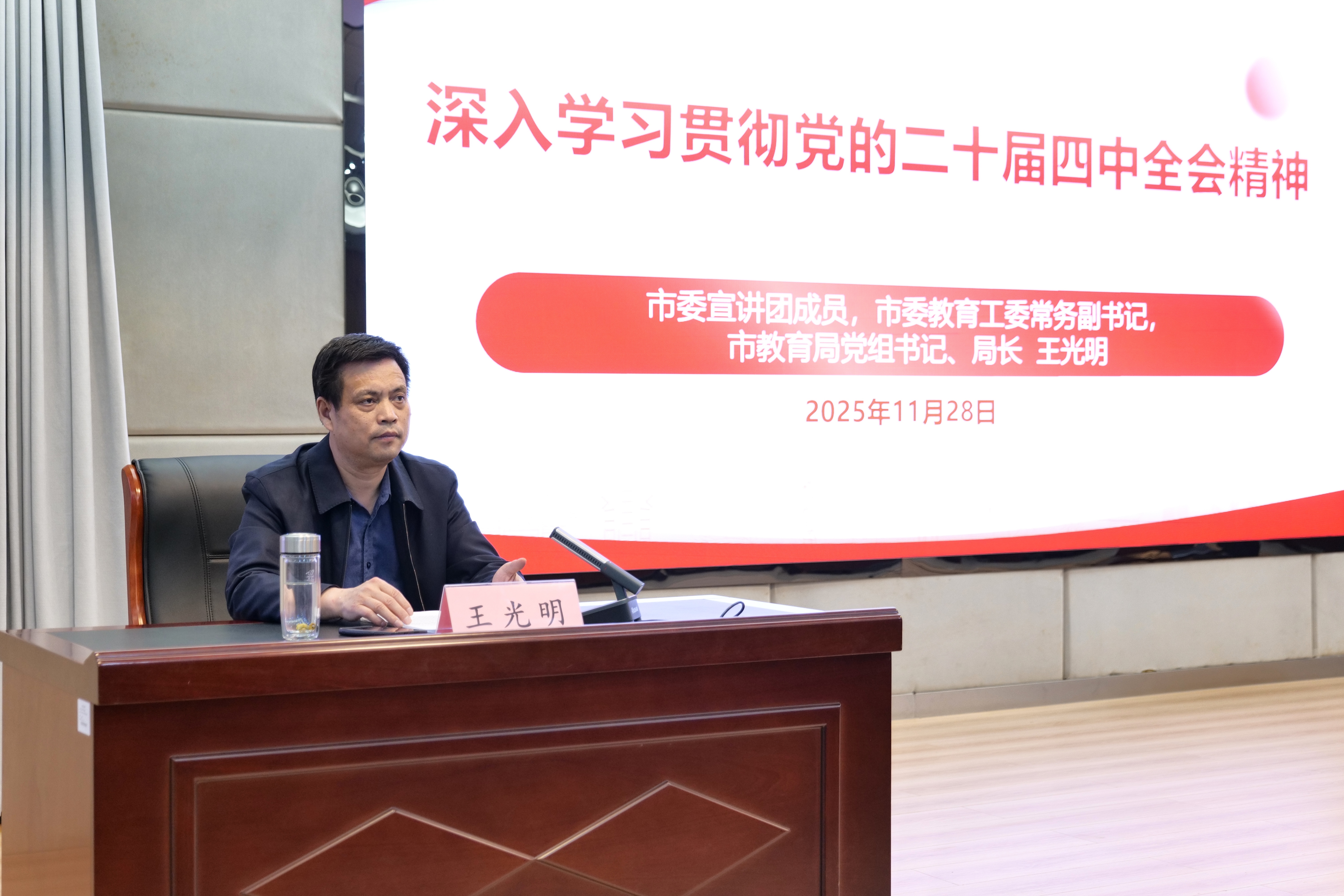 报告会上,王光明以《深入学习贯彻党的二十届四中全会精神》为题,从三个方面讲解了怎样准确把握“十五五”时期在基本实现社会主义现代化进程中的重要地位;从两个推动、一个确保,深刻领会“十五五”时期经济社会发展的指导方针和主要目标;从十二个方面全面理解“十五五”时期经济社会发展的战略任务和重大举措;从三个方面全面讲解了坚持和加强党的全面领导,凝聚起推进中国式现代化的磅礴力量;从学前教育、基础教育、职业教育擘画了深入贯彻落实党的二十届四中全会精神,扎实推进“十五五”时期教育强市建设。他对学院取得的成绩给予了充分肯定和鼓励。整场宣讲报告简洁明了、深入通透,讲得清、说得透、听得懂,也为下一步学院深入学习贯彻党的二十届四中全会精神、推进各项工作落实,奠定了坚实思想基础。